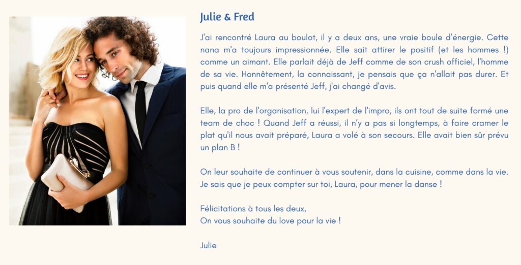 Avec le Bar à Souvenirs, on rit, on raconte une anecdote, un souvenir émouvant que le couple découvrira avec plaisir.