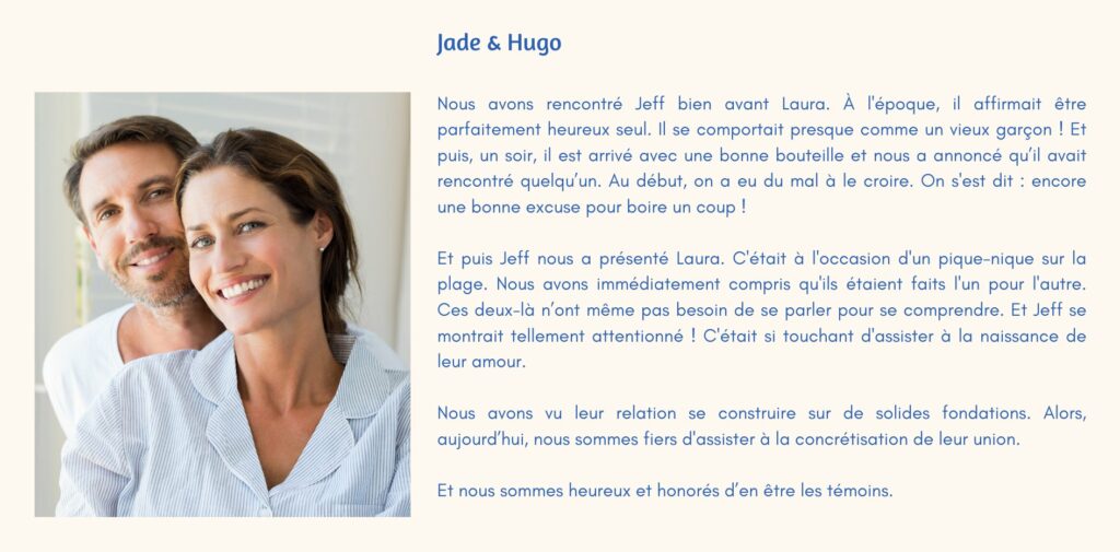 La scénographie sert une narration émotionnelle qui mérite d’être racontée dans un livre de mariage. Un livre qui complète les photos professionnelles, qui décrit tout ce qu’on ne voit pas sur les images. Avec les mots, vous revivez chaque instant : vous entendez les mots de l’officiant et les applaudissements, vous sentez les larmes de joie couler sur vos joues et celles de vos parents, vous entendez les éclats de rire et les chansons qui vous ont fait danser toute la nuit.